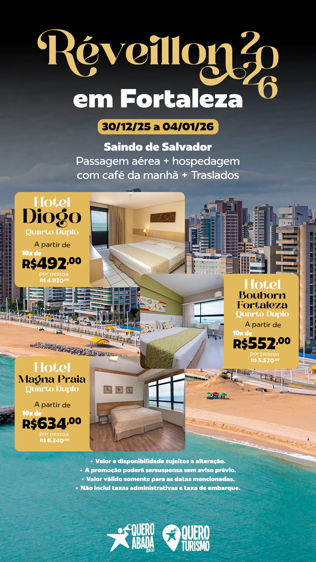 Desperte em 2026 com os pés na areia, curtindo festas inesquecíveis em resorts paradisíacos da Bahia! Escolha entre 4 opções exclusivas com tudo incluso ou meis pensão, shows especiais e a energia única do Réveillon baiano. Viva a virada que você merece!